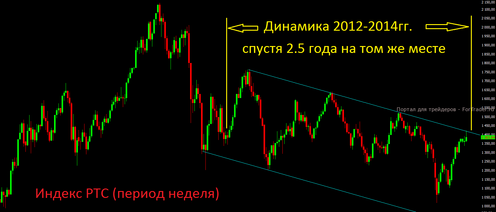 Если на дневном графике индекса ММВБ мы получили чёткий сигнал на разворот от сильного уровня сопротивления, то вот недельный график валютного индекса РТС выглядит ещё оптимистично и на нём нет никаких намёков на коррекцию. С другой стороны, стоит обратить внимание на сформировавшийся с конца 2011 года нисходящий тренд. Как мы видим, он пока не пробит, а значит, велика сейчас вероятность отскока от его верхней границы. Говорить об уверенном развороте на недельном графике индекса РТС можно будет только после закрытия недели ниже отметки 1300 пунктов. В случае разворота, цели коррекции откроются ниже минимум текущего года, но такой пессимистичный сценарий в этом году вряд ли осуществится. Переписывать минимумы текущего года мы, скорее всего, будем уже в следующем году, а пока можем довольствоваться нулевой динамикой за последние 2.5 года и даже за 4 года.