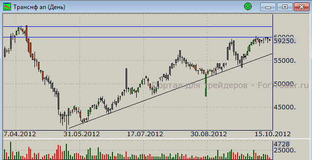 Последние несколько торговых сессий движение наверх остановилось. Покупателям оказывается сопротивление в районе отметки 60 000 рублей. В целом, диапазон 60 000 — 62 000 рублей сейчас является внушительной преградой для покупателей. Технически закрепление цен выше отметки 60000 будет способствовать тестированию ими годового максимума у верхней границы зоны сопротивления. Слабость покупателей приведет к откату котировок в район линии спроса летнего восходящего тренда.