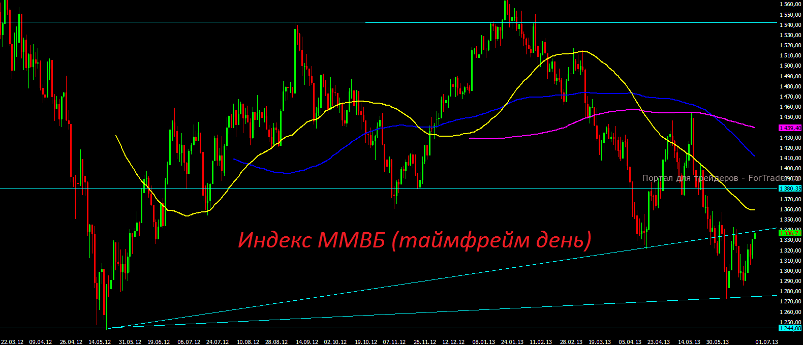 Стоит отметить улучшение деловой активности в производственном секторе Японии и целому ряду европейских стран. Особенно заметны эти улучшения были как раз именно в южных странах еврозоны, которым на руку сейчас играет горячий туристический сезон. Стоит закладываться на то, что и деловая активность в секторе услуг в этих странах, данные по которой выйдут также на этой неделе, покажет существенное восстановление. В нейтральном ключе можно оценить последние данные по деловой активности в промышленном секторе Китая и немного разочаровали данные из Германии. Зато в США данный индикатор продолжает уверенно находиться выше отметки в 50 пунктов, что свидетельствует о продолжающемся восстановлении обрабатывающего сектора. Также стоит отметить ещё один позитивный момент по европейскому региону – это снижение общего уровня безработицы на 0.2% до 12.1%. Значение показателя в предыдущем месяце было пересмотрено с 12,2% до 12%. Результат оказался гораздо лучше прогнозов экспертов, которые ожидали роста безработицы в мае до 12,3%. Все эти данные безусловно поддержали настой инвесторов на мировых площадках, однако без новых драйверов до конца недели рынкам будет идти вверх тяжело. Скорее всего, несмотря на позитивный настрой участников рынка мы будем наблюдать консолидацию вблизи текущих уровней в ожидании выхода очередного отчёта по безработице в США от министерства труда. Тем, кто в июне формировал длинные позиции, мы пока рекомендуем их удерживать и если и текущая неделя будет закрыта на положительной территории, то потенциал роста у российского рынка откроется на 7-8%. Пока же говорить о локальном развороте рановато.