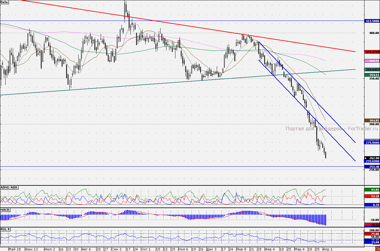 Среди лидеров падения первой половины дня стоит отметить акции «Северстали». Бумаги тянет вниз «медвежья» цель в районе 253,48 руб., где находится незакрытый гэп от 11 января 2010 года. Пока вероятность того, что бумаги продолжат снижение, достаточно велика. Индикатор ADMI/ADX показывает, что преимущество на стороне продавцов (линия «медведей» находится выше линии «быков»), при этом график индикатора MACD (12;26;9) по-прежнему находится на отрицательной территории. Наш 30-минутный торговый робот находится в «шортах», удерживая короткие позиции от отметки 273,9 руб. Таким образом, короткие позиции по бумагам пока более привлекательны.