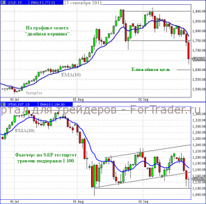 В начале августа на фондовом рынке произошло сильное падение, что создало повышенную нервозность и противоречивость в ожиданиях инвесторов. Тем не менее, за месяц рынок несколько успокоился и начал медленно восстанавливаться. На дневных графиках индекса Доу-Джонс и фьючерсного контракта на индекс S&P обозначились восходящие каналы, в которых цена, с точки зрения технического анализа, совершала достаточно «правильные» движения. Успокоился и рынок золота, два месяца безудержно рвавшийся вверх.