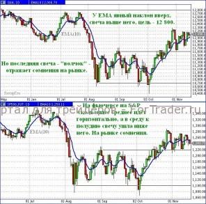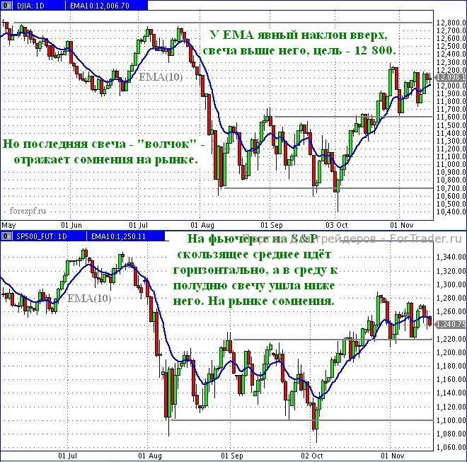 Во вторник, 15 ноября, американская сессия завершилась спокойно. Индекс Доу-Джонса сформировал на дневном графике свечу выше скользящего среднего ЕМА(10), рисующего линию текущего тренда. У ЕМА виден явный наклон вверх, что обещает продолжение восходящего тренда с целью на уровне 12 800. Казалось бы, можно покупать. Однако последняя свеча имеет малое тело – где открылись, практически там и закрылись. Обычно это служит отражением возникших на рынке сомнений.
