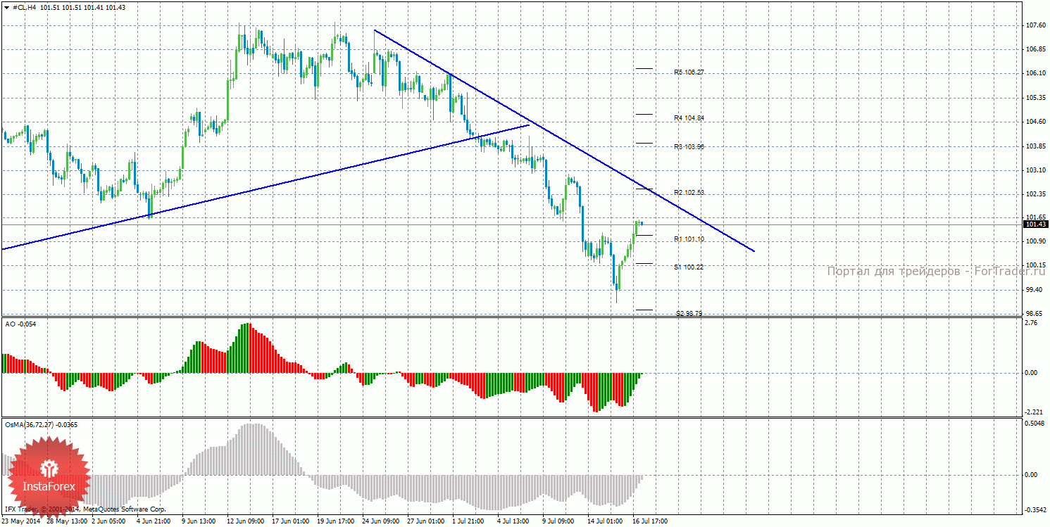 Анализ сырой нефти за 17 июля показывает, что цена продолжает корректироваться, о чем свидетельствуют оба индикатора, направленные наверх. Нисходящее движение может возобновиться с целями S1 – 100,22 и S2 – 98,79, если цена закрепится ниже уровня 101,10. Целями для продолжения восходящей коррекции выступают уровни сопротивления 102,53 и 103,96, если цена останется выше уровня 101,10. Сформирована новая нисходящая линия тренда, которая поддерживает торгующих на понижение и делает актуальными короткие позиции. Если цена закрепится выше линии тренда, то тенденция на рынке поменяется на восходящую и станут актуальными длинные позиции. Индикатор Awesome показывает текущее восходящее движение, так как последний закрытый бар зеленого цвета. OsMA также направлен наверх, что говорит о восходящем характере движения и в более долгосрочном плане. Если цена отскочит от линии тренда, это может спровоцировать возобновление нисходящего движения.