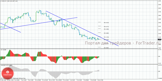 Анализ природного газа за 17 июля показывает, что цена продолжает нисходящее движение и еле-еле закрепилась ниже уровня поддержки S1. На данный момент актуально нисходящее движение с целями уровни поддержки S2 – 4,0170 и S3 – 3,9230, если цена останется ниже уровня 4,1120. Целями для начала нового витка восходящей коррекции выступают уровни 4,1700 и 4,2650, если цена закрепится выше уровня 4,1120. Построена нисходящая линия тренда, которая оказывает поддержку торгующим на понижение и делает актуальными ордера на продажу. Индикатор Awesome показывает локальное восходящее движение, последний закрытый бар окрашен в зеленый цвет. OsMA также направлен наверх, что сигнализирует о восходящем движении цены на газ и в более долгосрочной перспективе. Отскок цены от уровня 4,0170 может спровоцировать начало восходящей коррекции.