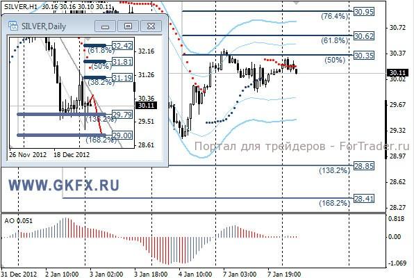 По серебру сегодня ситуация схожая с золотом, но оно по динамике цены менее склоняется к снижению. Значимые уровни на сегодня отмечены на графике. На дневном графике указал снижение вплоть до 29,00 на этой неделе. Индикатор АО в нейтральной зоне, указывая на некоторую неопределенность. Индикатор тренда указывает на снижение. Вне рынка.