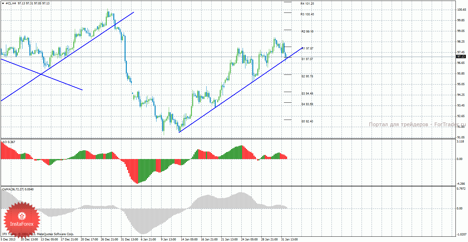 Анализ сырой нефти за 3 февраля показывает, что цена вновь начала корректироваться и отработала восходящую линию тренда, от которой может отскочить. Восходящее движение может возобновиться с целями R1 – 97,87 и R2 – 99,10, если цена отскочит от уровня 97,07. Может продолжиться нисходящее движение с целями 95,78 и 94,49, в случае, если цена закрепится ниже уровня 97,07. Восходящая линия тренда оказывает поддержку торгующим на повышение, если цена закрепится ниже нее, то тенденция на рынке может поменяться на нисходящую и станут актуальными короткие позиции. Индикатор Awesome показывает текущее нисходящее движение, так как последний закрытый бар красного цвета. OsMA также развернулся вниз, что говорит о нисходящем характере движения и в более долгосрочном плане. Если цена отскочит от уровня 97,07, это может засвидетельствовать завершение витка нисходящей коррекции.