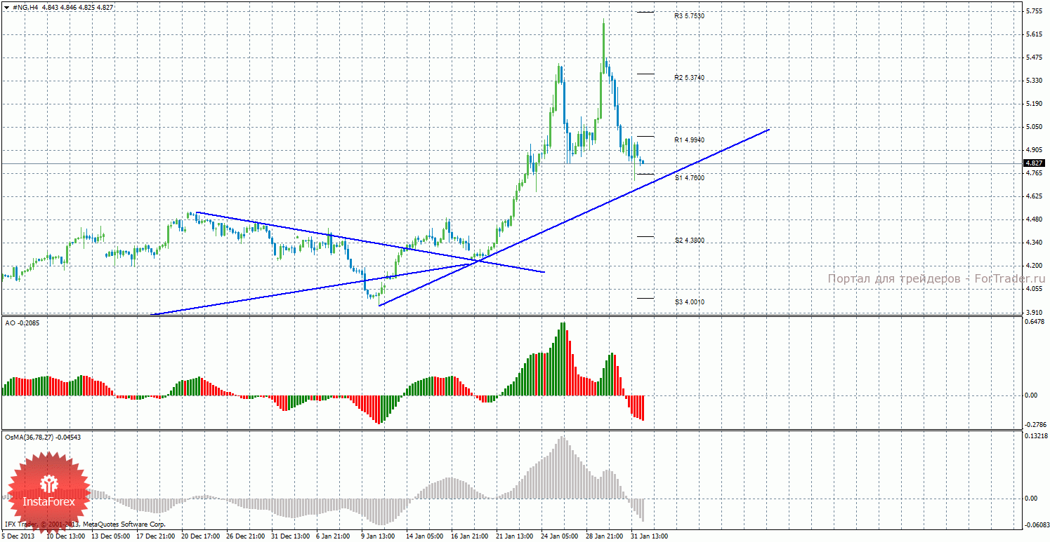 Анализ природного газа за 3 февраля показывает, что цена продолжает нисходящее коррекционное движение и уже почти отработала восходящую линию тренда. На данный момент актуально восходящее движение с целями уровни сопротивления R1 — 4,9940 и R2 – 5,3740, если цена отскочит от уровня 4,7600. Целями для возможного продолжения нисходящего движения выступают уровни поддержки 4,3800 и 4,0010, если цена закрепится ниже линии тренда. Построена восходящая линия тренда, которая оказывает поддержку торгующим на повышение, цена пока что находится выше нее. Индикатор Awesome показывает локальное нисходящее движение, последний закрытый бар окрашен в красный цвет. OsMA также направлен вниз, что сигнализирует о нисходящем движении цены на газ и в более долгосрочной перспективе. Если цена отскочит от линии тренда, это может спровоцировать возобновление восходящего движения.