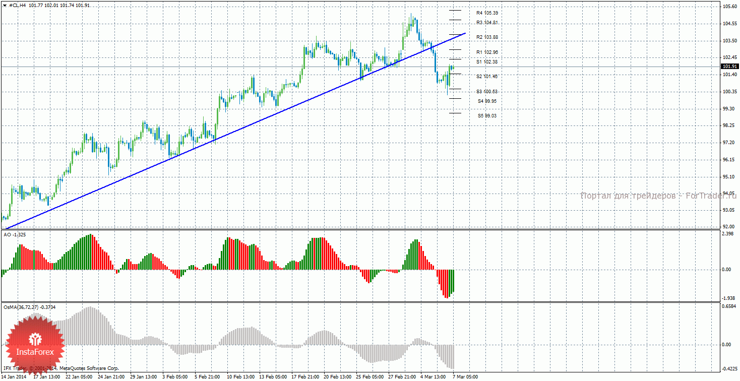 Анализ сырой нефти за 7 марта показывает, что цена не сумела преодолеть уровень поддержки S3 – 100,53 и отскочила от него, начав восходящую коррекцию. Нисходящее движение может продолжиться с целями S3 – 100,53 и S4 – 99,95, если цена закрепится ниже уровня 101,46. Может продолжиться восходящая коррекция с целями 102,38 и 102,96, в случае, если цена останется выше уровня 101,46. Восходящая линия тренда больше не оказывает поддержку торгующим на повышение, цена располагается ниже нее, поэтому сейчас стали актуальными короткие позиции. Индикатор Awesome показывает текущее восходящее движение, так как последний закрытый бар зеленого цвета. OsMA же направлен вниз, что говорит о нисходящем характере движения в более долгосрочном плане. Отскок от уровня 102,38 может спровоцировать возобновление нисходящего движения.