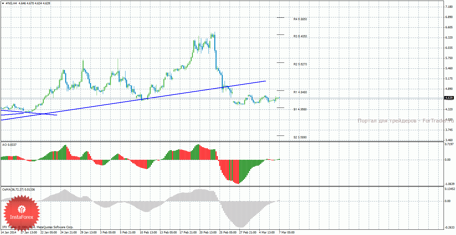 Анализ природного газа за 7 марта показывает, что цена продолжает находиться ниже восходящей линии тренда, а также между уровнями S1 и R1. На данный момент актуально нисходящее движение с целями уровни поддержки S1 – 4,3680 и S2 – 3,5890. Целями для возможной восходящей коррекции выступают уровни сопротивления 4,8480 и 5,6270. Цена закрепилась ниже восходящей линии тренда, поэтому она более не актуальна, тенденция на рынке поменялась на нисходящую. Нисходящей линии тренда пока что нет. Индикатор Awesome показывает локальное восходящее движение, последний закрытый бар окрашен в зеленый цвет. OsMA также направлен вверх, что сигнализирует о восходящем движении цены на газ и в более долгосрочной перспективе. Если цена отскочит от уровня 4,8480, это может засвидетельствовать завершение витка восходящей коррекции.