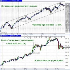 Краткосрочный канал зародился в середине марта. Неделю назад Доу упал до его нижней границы, то есть достиг ключевой точки, в которой рекомендуется планировать операции. Отражения вверх не произошло, и Доу бочком вышел из краткосрочного восходящего канала.