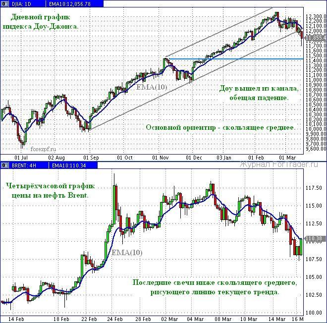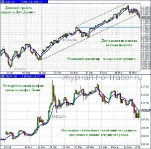 На американском фондовом рынке произошло принципиальное событие – индекс Доу-Джонса ушёл вниз из канала, просматривающегося на дневном графике. Ещё в пятницу, 11 марта, от нижней границы Доу пытался уйти вверх, подавая надежду на то, что коррекция завершается. Однако на фоне японской трагедии рост рынка уже вызывал сомнения. Во вторник, 15 марта, на американском рынке произошло сильное падение. На дневном графике индекса Доу-Джонса скользящее среднее ЕМА(10), рисующее линию текущего тренда, приобрело явный наклон вниз, указывая новую тенденцию. Последние свечи расположены ниже скользящего среднего, что тоже обещает дальнейшее падение. С точки зрения технического анализа, ближайшей поддержкой может быть уровень 11 400, примерно соответствующий максимальному значению индекса в ноябре прошлого года. Рост американского рынка начался в сентябре, более полугода проходил очень уверенно и активно, в такой ситуации более-менее глубокая коррекция кажется вполне естественной.