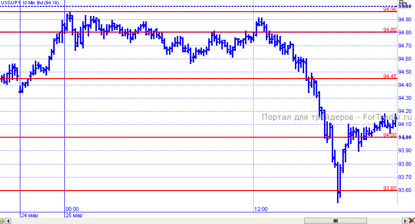 USD/JPY продолжила движение вниз, в основном, благодаря традиционным репатриационным потокам в связи с окончанием финансового года в Японии. Пара открыла день на 94,37, скатилась к минимуму 93,52, закрыв день в районе 94,10.