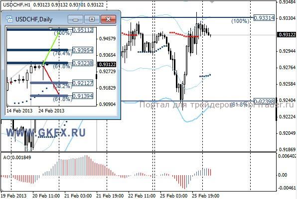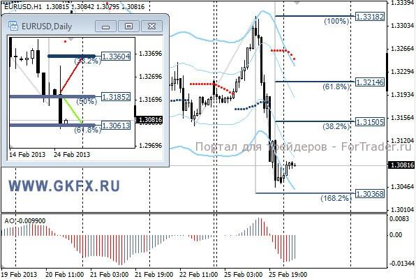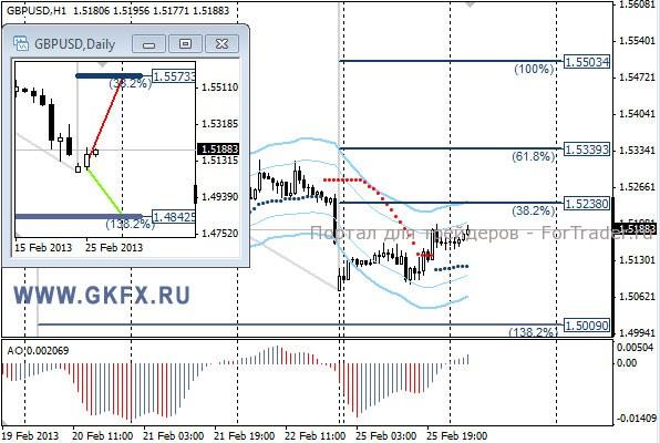 Пара EURUSD торговалась очень волатильно в понедельник на фоне выборов в Италии. Участники рынка реагировали на опросы и предварительные данные по выборам. На текущий момент все выглядит для дальнейшего снижения пары. Предположительно безопасные уровни для продаж 1,3150-1,3160. Сегодня одним из важных событий может стать выступление председателя ФРС Бена Бернанке, которое может стать катализатором для движения валют. На этой неделе рассматриваю традиционно два варианта возможного движения цены, основной красный и альтернативный зеленый, склоняюсь к красному. Значимые уровни на сегодня отмечены на часовом графике. Индикатор АО в отрицательной зоне и растет, указывая на коррекцию перед возможным дальнейшим снижением. Индикатор тренда указывает на снижение. Безопасного места для входа на текущий момент нет.