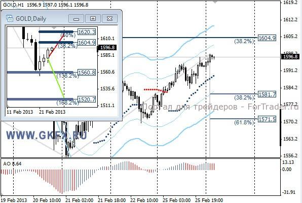 Цены на золото продолжили корректироваться в повышающейся конструкции в соответствии с ожиданиями. Возможно, у сегодняшнего максимума цена задержится какое-то время, либо даже направится вниз. На дневном графике традиционно делаю два варианта движения цены на неделю, основной красный и альтернативный зеленый, склоняюсь к красному. Значимые уровни на сегодня отмечены на часовом графике. Индикатор АО в положительной зоне и снижается, указывая на коррективное движение цены перед возможным продолжением роста. Индикатор тренда указывает на рост. Sell 1595.0 со стопом 1600,0. Цель 1583,0.