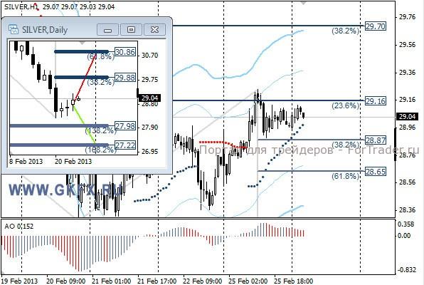 Цены на серебро уже пошли на снижение, которое может продолжиться до 28,65. На дневном графике делаю два варианта движения цены на неделю, основной красный и альтернативный зеленый, склоняюсь к красному. Значимые уровни на сегодня отмечены на часовом графике. Индикатор АО в положительной зоне и снижается, указывая на коррективное движение цены перед возможным продолжением роста. Индикатор тренда указывает на снижение. Вне рынка.