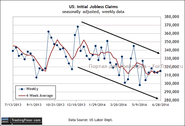 На данный момент есть все основания не воспринимать серьезно топтание на месте возле отметки 315 000, ведь на уровне годовых изменений количество заявок продолжает снижаться, причем довольно существенно: по итогам недели, завершившейся 28 июня, количество заявок сократилось на 8% по сравнению с аналогичным периодом прошлого года (с учетом сезонных факторов). И все же аналитики считают, что сегодня мы снова увидим значение 315 000, как и неделей ранее. Это, тем не менее, достойный результат, который означает падение количества заявок на 11% в годовом выражении. Другими словами, остановка процесса снижения заявок на данном этапе, возможно, ничего не значит.