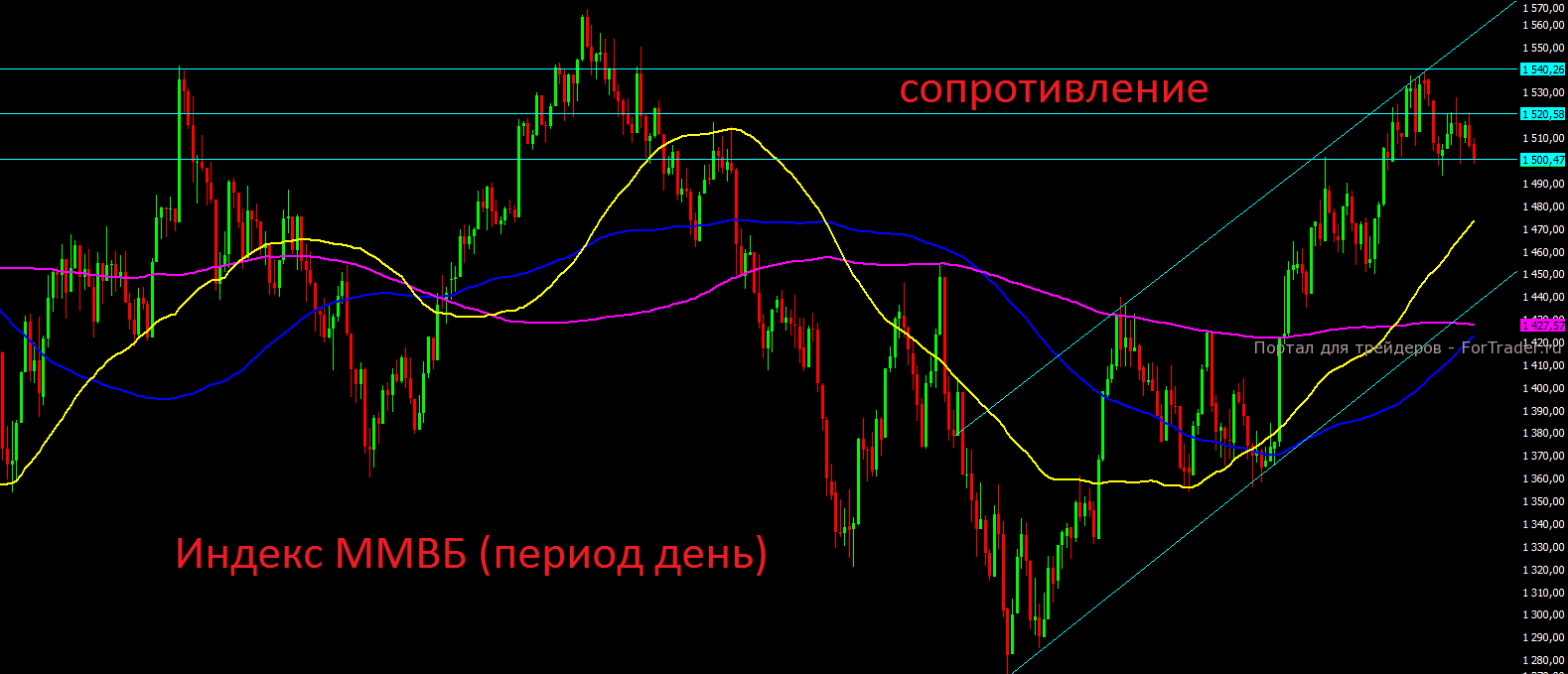 С технической точки зрения российский индекс ММВБ продолжает находиться в восходящем тренде, однако пока созревают все предпосылки для коррекции к нижней границе канала на отметке 1460 пунктов, это почти на 3% ниже текущего уровня. Пробой и закрытие дня ниже отметки 1490 пунктов явно усилит шансы медведей.