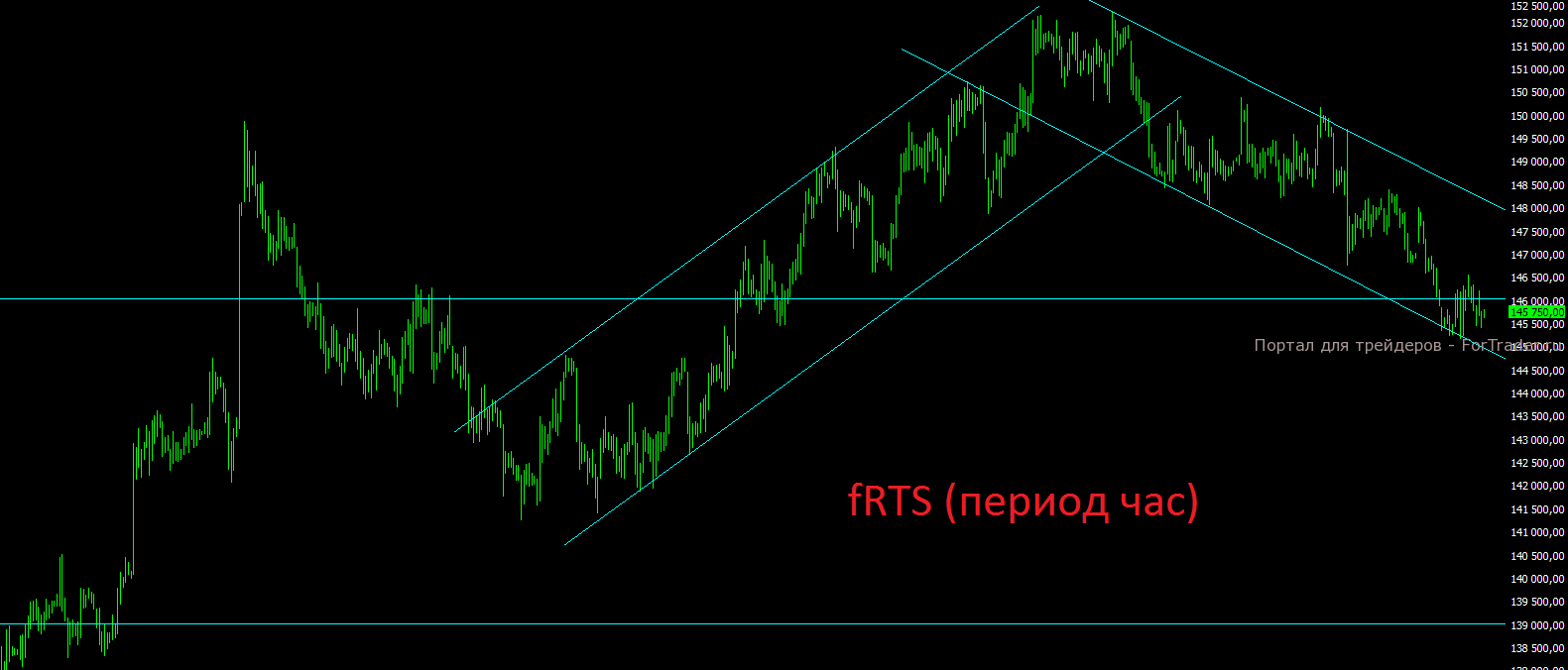 Фьючерс на индекс РТС продолжает медленно сползать в рамках нисходящего канала. Важным уровнем поддержки сейчас является отметка 145000 пунктов и в случае её пробоя стоит готовиться к движению до отметки 142000 пунктов. До пятницы или возможно до понедельника, мы не рекомендуем торопиться с покупками ни в этом активе, ни на рынке акций.