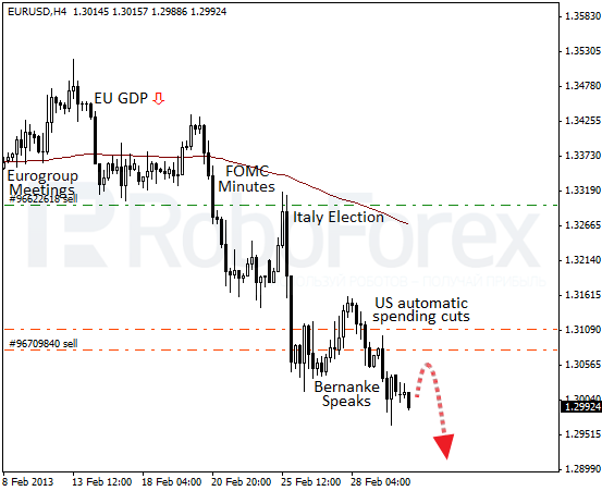 В целом начало автосеквестра в США на рынках пока воспринимается спокойно. EUR/USD даже успела обновить локальный минимум. В течение понедельника нельзя исключать развития коррекции, поскольку каких-то важных новостей не запланировано, а громких решений по итогам заседания Еврогруппы, скорее всего, не будет. В ближайшие недели можно ожидать развязки нынешнего политического кризиса в Италии. Если всё-таки будет объявлено о повторных парламентских выборах, евро может просесть ещё на несколько сотен пунктов.
