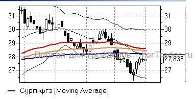 Сургутнефтегаз ао (+0,19%) – акции пытаются развить отскок от годовых минимумов, торгуясь недалеко от района «долгих» скользящих средних и средней полосы Боллинжера дневного графика (28,2-28,6 руб), которые вполне могут приостановить рост. Технические индикаторы дают умеренно положительные сигналы, не исключая развития повышения к указанным отметкам, однако, до их пробития лучше воздержаться от открытия новых «длинных» позиций ввиду опасности отскока от важных сопротивлений.