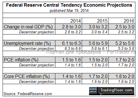 В сегодняшнем объявлении ФРС наибольший интерес для участников рынка представляет прогноз роста экономики. В предыдущем выпуске центральный банк США немного понизил свои прогнозы роста ВВП. К примеру, оценка роста за весь 2014 год в марте была уменьшена до 2,8-3% по сравнению с 2,8-3,2% в декабре.