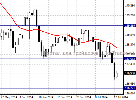 Продавать при отбое от уровня 137,60 с целями 137,00 и 136,30. Стоп-лосс = 138,20. Вчерашняя трагедия в воздушном пространстве Украины привела к распродажам на мировых фондовых рынках на фоне сворачивания операций «carry trade». Снижение индекса Nikkei 225 на 1,1% укрепило позиции йены на рынке FOREX. И сегодня министр финансов Японии Асо заявил о том, что напряженность на Украине может повлиять на Японию посредством более высоких цен на энергоносители.
