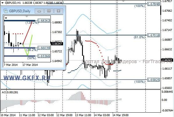 Пара GBPUSD торговалась у минимумов недели 1,6580 и закончила день в положительной зоне. Это дает шанс на продолжение роста пары на этой неделе. Тем не менее, в понедельник наблюдаем за предпочтениями рынка. Эта пара менее активно отреагировала на слабые данные по США, поэтому может случиться и дальнейшее снижение. Цены двигались на прошедшей неделе не по сценариям с самого начала недели. На эту неделю традиционно рассматриваю два варианта возможного движения цены, основной красный и альтернативный зеленый. Значимые уровни на сегодня отмечены на часовом графике. Индикатор АО находится в положительной зоне и растет, указывая на желание пары двигаться вверх в данное время. Индикатор тренда указывает на рост. Вне рынка.