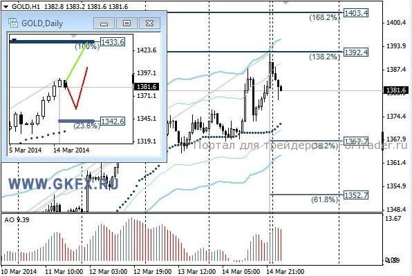 Цены на золото несмотря не на что продолжили рост, возможно благодаря росту цен на металлы платиновой группы из-за опасений по поводу возможных санкций в отношении России. Напряженность вокруг Украины не спадает и это оказывает поддержку ценам на золото. Возможно, рост продолжится на этой неделе плоть до 1430,0. На прошедшей неделе отработался красный вариант движения цены. Традиционно делаю два варианта движения цены на неделю, основной красный и альтернативный зеленый. Значимые уровни на сегодня отмечены на часовом графике. Индикатор АО находится в положительной зоне и снижается, указывая на коррекцию перед возможным продолжением роста. Индикатор тренда указывает на рост. Сегодня наблюдаем за предпочтениями рынка.