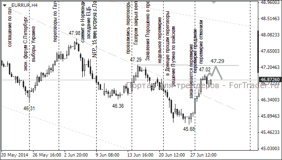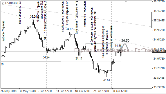 Российский рубль в среду торговался в боковом тренде. Напряжённая ситуация на Украине продолжает оказывать давление на российскую валюту. Курс доллара колеблется на уровне 34,28. Сопротивление находится на отметке 34,50. Курс евро закрылся на отметке 46,87. Тенденция к росту евро сохраняется. Ближайшая цель – 47,29.