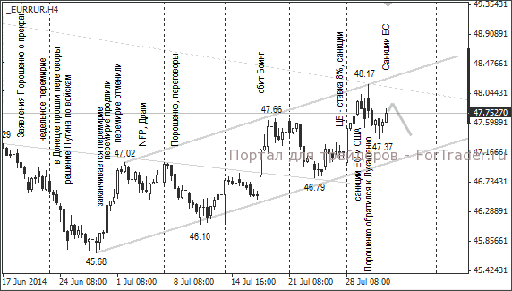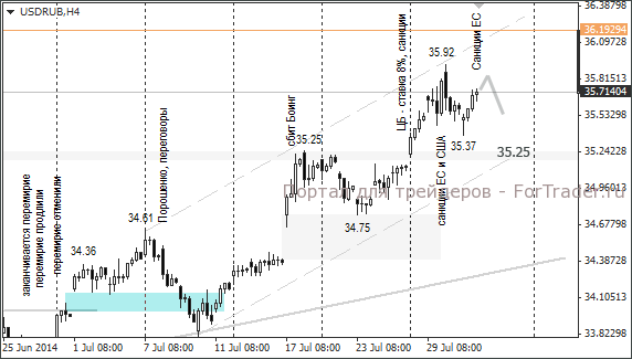 Напряжённые отношения с США, ЕС и Украиной не дают рублю укрепиться против евро и доллара. И, несмотря на то, что большинство факторов играют против российского рубля, курс доллара по-прежнему не превышает 36 рублей, а евро – 48 рублей. Если отталкиваться от технического анализа, то в границах своих восходящих каналов рубль способен укрепиться против доллара до 35,25, и против евро до 47,20.