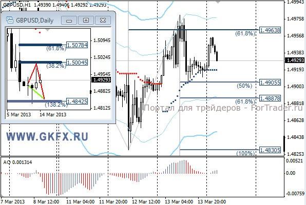 Пара GBPUSD соответствовала предположительной динамике. Сделка по рекомендации закрылась по профиту 50 пунктов. Сегодня, возможно, будет преобладать снижение до 1,4885, хотя фунт смотрится более уверенно, чем евро. По этой причине сегодня по этой паре рекомендаций не даю. На этой неделе по традиции рассматриваю два варианта возможного движения цены, основной красный и альтернативный зеленый, придерживаюсь красного. Значимые уровни на сегодня отмечены на часовом графике. Индикатор АО в положительной зоне и растет, указывая на желание пары двигаться вверх. Индикатор тренда указывает на рост. Вне рынка.