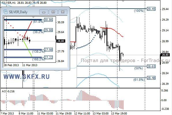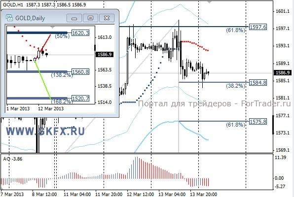 Цены на золото не смогли значительно подняться от точки входа в сделку по рекомендации, но возможность поставить стоп в безубыток была. В итоге сделка закрылась в ноль. Причиной послужил рост доллара после сильных данных по розничным продажам в США. Сегодня можно было повторить заход с чуть более привлекательных уровней, но динамика серебра настораживает и индикаторы за снижение. На дневном графике традиционно делаю два варианта движения цены на неделю, основной красный и альтернативный зеленый, склоняюсь к красному. Значимые уровни на сегодня отмечены на часовом графике. Индикатор АО в отрицательной зоне и снижается, указывая на желание инструмента двигаться вниз. Индикатор тренда указывает на снижение. Пытаемся купить малым объемом. Buy по 1584.0 или ниже со стопом 1580,0. Цель 1597,0.
