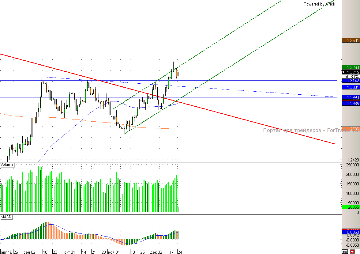Европейская валюта продолжает торговаться внутри восходящего канала. Верхняя граница данного канала сейчас проходит через отметку 1,33, а нижняя – 1,306. В текущий момент стоит ориентироваться на уровень 1,314, т.к. пробив данный уровень снижение продолжиться вплоть до 1,31. При этом закрепление выше отметки 1,33 будет способствовать дальнейшему росту европейской валюты. Первой целью для данного роста станет уровень 1,35. Движение по-прежнему будет зависеть от того, как быстро американские демократы и республиканцы найдут компромисс по «фискальному обрыву».