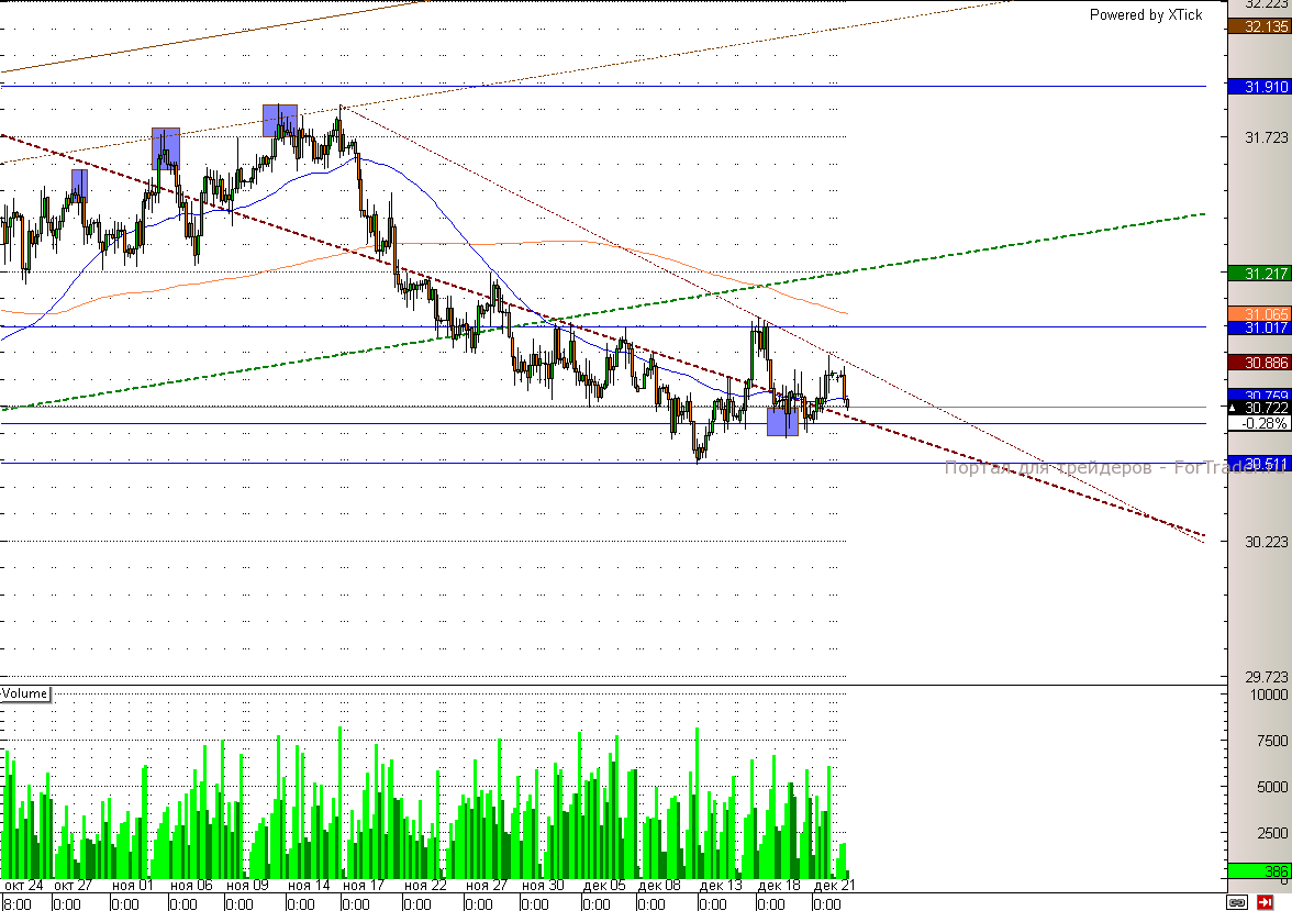 Российская валюта по-прежнему торгуется в диапазоне 30,5-31,2. Между тем пара доллар рубль все – таки закрепилась выше нисходящей трендовой линии, что увеличивает шансы доллара на продолжение отскока. Таким образом, пробой отметки 30,9 вероятно вернет пару на 31. Драйвером для данного ослабления рубля может стать снижение нефтяных котировок. Нефть сорта Brent и сегодня снижается на 0,3%. При этом поддержку рублю оказывает налоговый период в России.