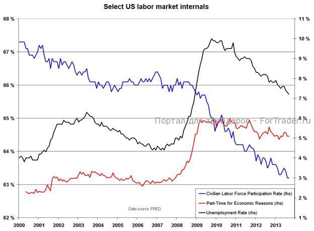 В сентябре доля экономически активного населения достигла нового минимума, и тенденция выглядит ужасающе. Доля населения, занятая на работе с частичной занятостью, также не снижается. Улучшения на рынке труда все еще не настолько значительные, как этого хотела бы ФРС, поэтому интересно узнать, как долго она будет пропагандировать «день сворачивания программы стимулирования».