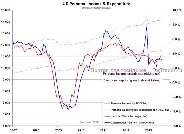 Ожидается, что личные доходы выросли на 0,3%, а расходы — на 0,2%. Сентябрьские данные к настоящему моменту уже немного устарели, и за это время произошли важные изменения (неожиданное решение не сворачивать программу стимулов и закрытие правительства). Тем не менее, эти данные могут подтвердить формирование очень важных тенденций. Годовые темпы изменения личных доходов за последние месяцы увеличились и указывают на потенциальный рост. Впоследствии это должно привести к увеличению расходов. Если потребительская активность будет развиваться, то это однозначно будет хорошей новостью для экономики в целом. Вспомните скачок доходов в декабре 2012 года, когда компании выплатили специальные дивиденды, однако за этим разовым событием последовало резкое ухудшение в январе. Таким образом, годовые темпы вскоре могут стать довольно неустойчивыми. В блоге Sober Look тема показателей за декабрь 2012 года обсуждалась еще в марте.