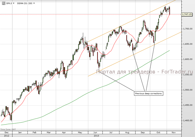 Фондовый рынок на протяжении последних двух недель торговался в узком диапазоне, а в четверг пробил этот диапазон. Судя по графику, коррекция может усилиться. Резкая реакция на данные о ВВП свидетельствует о том, что рынок очень уязвим перед благоприятной статистикой, которая приближает момент сворачивания программы стимулирования.