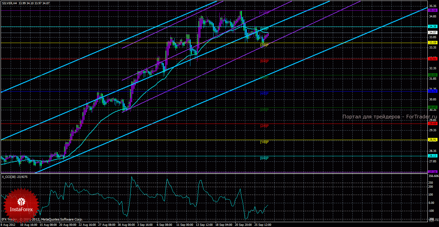 Исходя из анализа серебра 27 сентября, видно, что инструмент продолжает коррекцию и закрепился ниже скользящей средней, поэтому коррекция может получиться глубокой. Старший канал направлен наверх, что свидетельствует о восходящем направлении движения глобального тренда. Младший канал направлен наверх, что означает восходящее движение в менее долгосрочном плане. Сейчас цена находится ниже мувинга и ниже уровня Мюррея «8/8», что делает более вероятным продолжение нисходящего движения. Первой целью нисходящего движения является уровень Мюррея «7/8» — 33,59, но рассматривать короткие позиции сейчас преждевременно. В случае преодоления ценой этой отметки, новой целью для нисходящего движения станет уровень Мюррея «6/8» — 35,94. Скользящая средняя направлена вбок, а цена в свою очередь находится ниже нее, что сигнализирует о текущем нисходящем направлении движения. Короткие позиции можно будет вновь рассматривать, если развернется вниз один из каналов линейной регрессии. Ордера на покупку можно будет рассматривать только после закрепления цены выше скользящей средней. Хайкен Аши окрасил последние бары в фиолетовый цвет, что сигнализирует о локальном восходящем движении. Индикатор CCI находится около нулевого уровня, что свидетельствует об отсутствии какой-либо перекупленности или перепроданности инструмента.