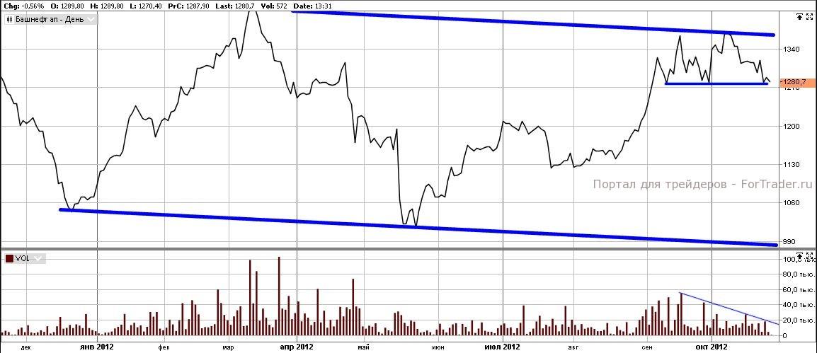 Падение американского индекса Dow Jones за 4 дня на 3,72%, индекса S&P500 на 3,32%, а так же падения нефти марки Brent на 5,7% в течении пяти дней, на фоне укрепления американской валюты (Dollar Index +1.43% за пять дней), явно свидетельствуют о присутствующих медвежьих настроениях. Не исключением являются и акции Башнефти. Среднесрочный тренд, берущий начало с середины мая 2012 года, подает явные признаки ослабления. Это грозит переходом в более сильную нисходящую тенденцию. Чисто технически, мы считаем, что акции (привилегированные) преодолеют отметку 1277 руб. с началом затяжного падения до 1000 руб. за акцию.