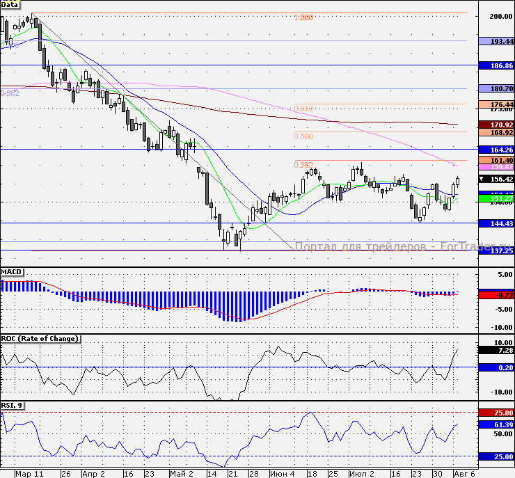 Складывающийся с утра внешний фон может способствовать небольшой фиксации прибыли в начале торгов. При этом ближайшей поддержкой выступает отметка 155 руб. В случае улучшения настроений инвесторов высока вероятность, что акции могут переписать максимум с середины июля текущего года (157,6 руб.). Более значимым уровнем сопротивления выступает отметка 160 руб.