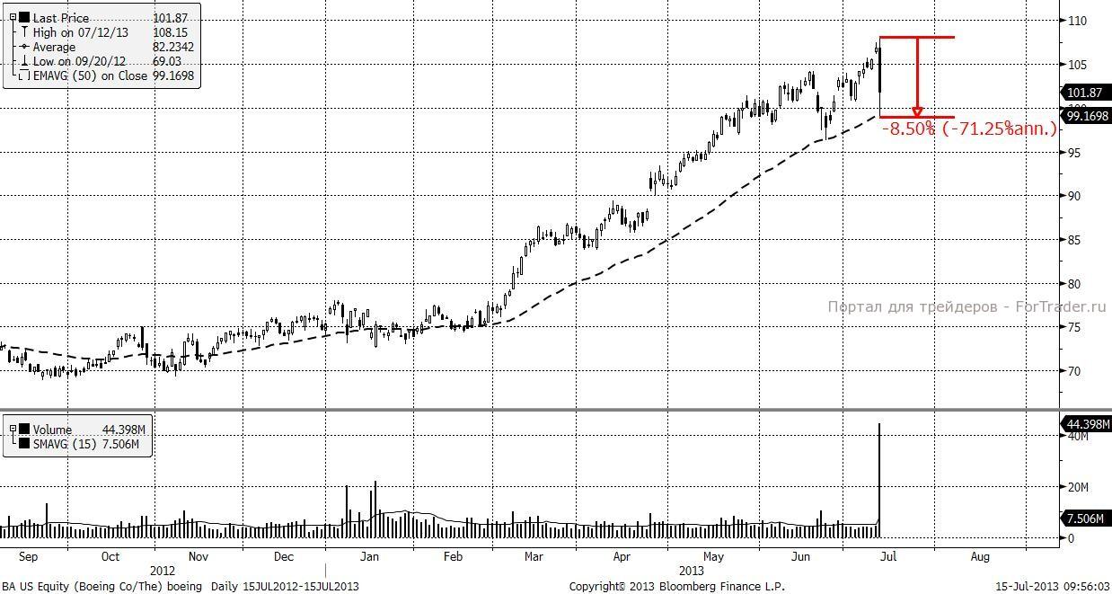 Пожар на самолете Boeing 787 Dreamliner в лондонском аэропорту «Хитроу» ощутимо ударил по котировкам производителя. Акции Boeing на пятничных торгах опускались на 8,5%, достигая своих средних значений цены за 50 дней. Репутации компании нанесен ущерб, однако фондовые игроки уже отыграли это. Судя по техническому анализу, рост акций продолжится и сейчас самое время их «подбирать».
