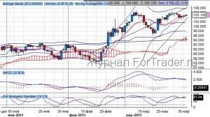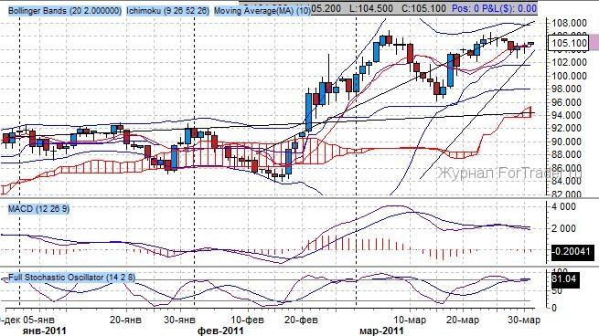 Котировки установили ныне действующую формацию «восходящий флаг» после пробоя уровня 94 пункта от 20 февраля. Ранее была предпринята успешная попытка подъема котировок в рамках восходящего канала на фоне реализации комбинации японских свеч «бычья контратака», образованная от 22 марта. При этом все внимание на пробой уровня сопротивления – 106.50 пунктов – психологический уровень, его преодоление приведет котировки к уровню 108.00 пунктов. Поддержка проходит через уровень 102 пункта.