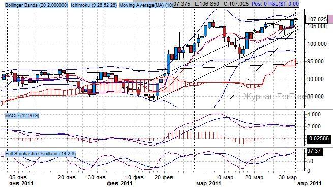 Котировки установили ныне действующую формацию «восходящий флаг» после пробоя уровня 94 пункта от 20 февраля. Ранее была предпринята успешная попытка подъема котировок в рамках восходящего канала на фоне реализации комбинации японских свеч «бычья контратака», образованная от 30 марта. При этом все внимание на пробой уровня сопротивления – 106.70 пунктов – психологический уровень, его преодоление открыло котировкам путь к уровню 108.00 пунктов. Поддержка проходит через уровень 102 пункта.