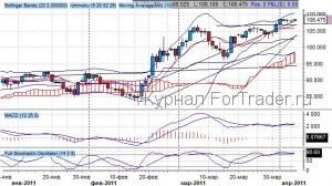 Согласно данным индикатора Bollinger Bands, получен успешный тест предыдущей вершины на 106.70 пункта под верхней границей канала, которая располагается на уровне 110.00 пунктов. Отмечаем повышательный тренд по котировкам на фоне достижения ключевых значений после пробоя уровня 106.70.
