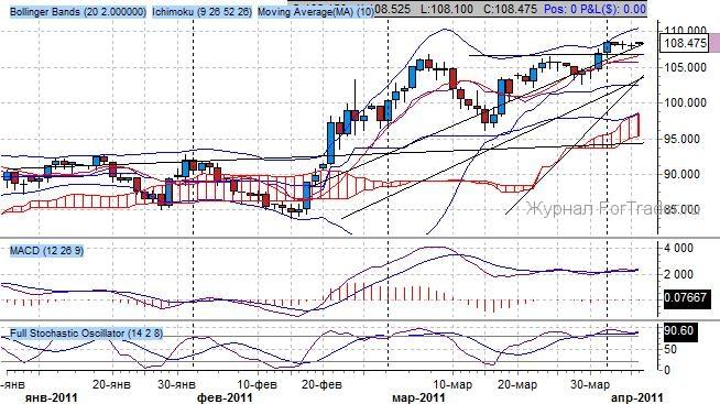 Котировки установили ныне действующую формацию «восходящий флаг» после пробоя уровня 94 пункта от 20 февраля. Ранее была предпринята успешная попытка подъема котировок в рамках восходящего канала на фоне реализации комбинации японских свеч «бычья контратака», образованная от 30 марта. При этом все внимание на пробой уровня сопротивления – 106.70 пунктов – психологический уровень, его преодоление открыло котировкам путь к уровню 108.00 пунктов и далее на 110 пунктов. Поддержка проходит через уровень 102 пункта.