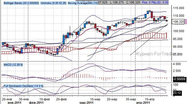 Котировки установили ныне действующую формацию «восходящий флаг» после пробоя уровня 94 пункта от 20 февраля. Ранее повышательный импульс начался с пробоя уровня сопротивления – 106.70 пунктов – психологический уровень, его преодоление открыло котировкам путь к уровню 110.00 пунктов и далее на 111.50 пунктов. Поддержка и разворотный уровень проходит через уровень 105.00 пункта.