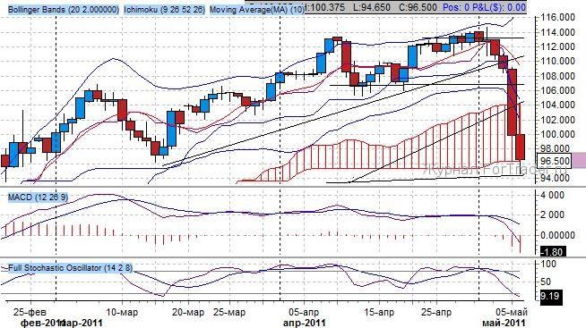 Согласно данным индикатора Bollinger Bands, получен успешный разворот от верхней границы канала, которая располагается на уровне 115.00 $/баррель. Ключевые скользящие средние индикатора Ишимоку находятся в понижательном пересечении и синхронно торгуются понижательно – признак понижательного тренда.