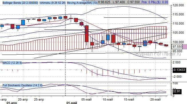 Согласно данным индикатора Bollinger Bands, получен успешный разворот к нижней границе канала, которая располагается на уровне 95.00 $/баррель. Ключевые скользящие средние индикатора Ишимоку находятся в повышательном пересечении и синхронно торгуются горизонтально – признак зарождения тренда.