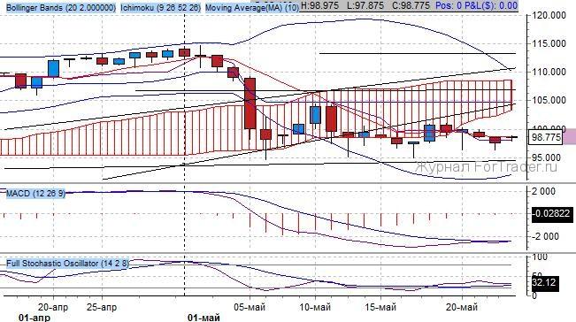 Согласно данным индикатора Bollinger Bands, получен успешный разворот к нижней границе канала, которая располагается на уровне 95.00 $/баррель. Ключевые скользящие средние индикатора Ишимоку находятся в понижательном пересечении и синхронно торгуются горизонтально – признак замедления тренда.