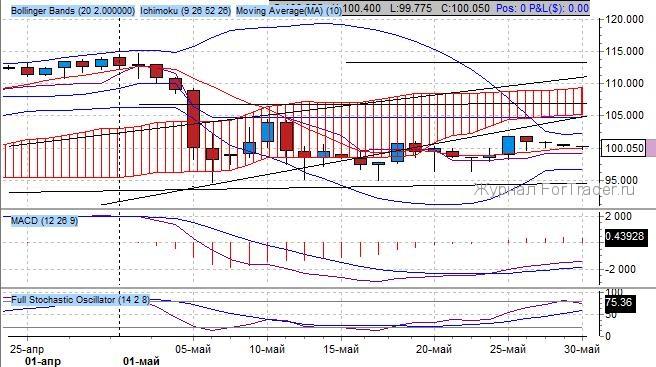 Индикатор MACD подтверждает усиление позиций «быков», сглаженные объемы на период 9 сигнализируют о росте значения индикатора при переходе в положительную область. Скользящие средние находятся в «бычьем» пересечении. На графике фьючерс находится в бычьей конвергенции, так как последний рост на графике цен подтвердился соответствующим значением индикатора, признак покупок на объемах.